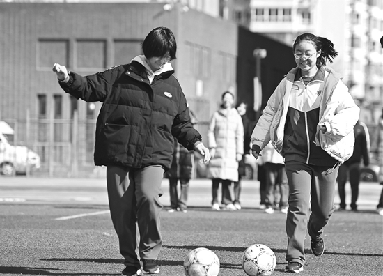 2月13日,天津市耀华中学学生在体育课上踢足球。