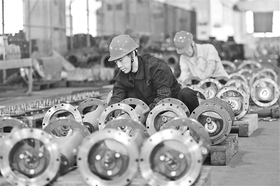 2月13日,工人在福建福州闽侯县的毅飞泵业(福州) 有限公司生产线上组装水泵部件。