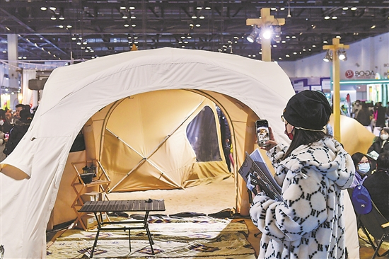 2月10日至12日,2023第十七届亚洲运动用品与时尚展在国家会议中心举办。图为参观者在展会上体验露营产品。