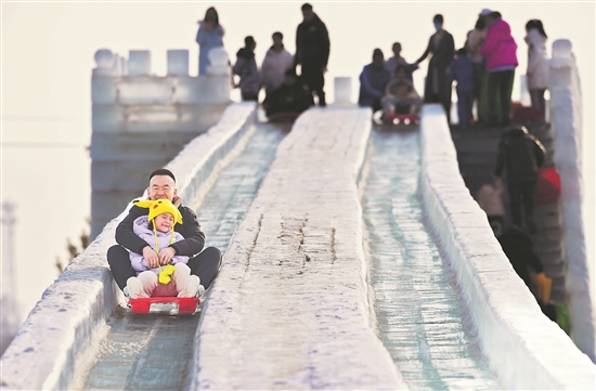 近年来,内蒙古自治区呼和浩特市依托独特的气候条件,持续丰富大众“冰雪+体育+旅游”业态产品供给,通过冰雪节、冰雪嘉年华等载体,将冰雪与科技、时尚、动漫、游戏相结合,让冰雪产业走上多重业态融合发展之路,不断释放经济发展动能。图为近日游客在呼和浩特冰雪节冰雪景区体验冰滑梯。新华社发(王正 摄)