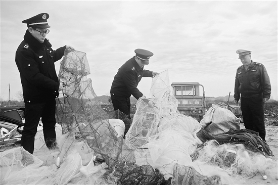 2月14日,安徽省马鞍山市含山县农业综合执法大队执法人员正在销毁非法捕捞地笼网、电捕设备等渔具。当日,含山县长江禁捕退捕工作领导小组办公室举行罚没渔具、网具销毁现场会,现场销毁电捕设备11套、地笼网30条、鱼竿66个、三层丝网8条、拦河网2条,营造全民自觉抵制非法捕捞和破坏渔业资源,保护禁捕水域生态环境的良好氛围。本报通讯员 苏自山 丁举高 摄