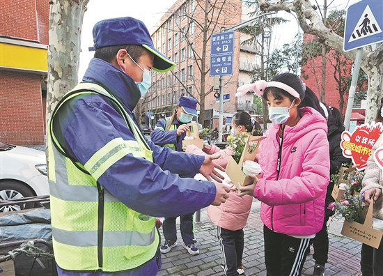 2月15日,黄浦区特殊教育职业学校的学生们将咖啡与花赠送给环卫工人。
