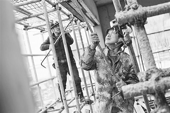 图为湖北黄石一处建筑工地上,工人们戴着安全帽、防护手套,通力合作加紧施工。
