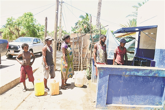 2021年3月,中铁十八局集团在马达加斯加西南部沿海城市图利亚拉市启动了供水项目建设工作。该项目由世界银行投资,在市区和市郊共铺设57公里供水管道,实现480户自来水入户安装,并建设200套集中供水房,最终覆盖的受惠人群预计达7.5万人。图为近日在图利亚拉市,当地人在集中供水房前排队打水。