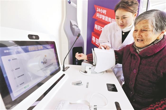 2月16日,在湖州市德清县阜溪街道兴山未来社区居家养老服务中心,家庭医生辅助社区老人进行云问诊。
