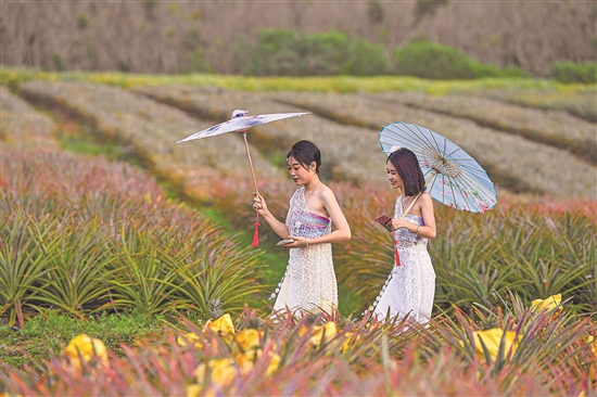 2月18日,游客在位于海南省儋州市的嘉禾共享农庄凤梨园游玩。