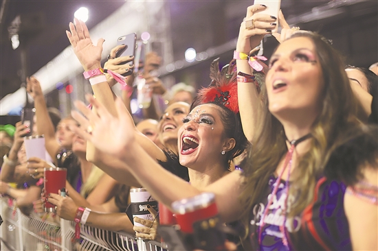 当地时间2月17日晚,2023年巴西圣保罗狂欢节桑巴巡演活动拉开帷幕。图为人们在圣保罗市阿年比桑巴大道观看狂欢节表演。