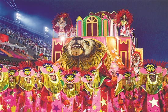 当地时间2月17日晚,2023年巴西里约热内卢狂欢节桑巴巡演活动拉开帷幕。这是当晚在里约热内卢桑巴大道拍摄的花车巡游。