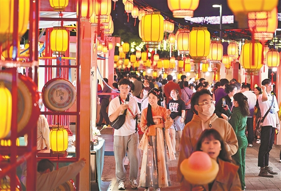图为游客在海口日月广场逛古风市集。新华社记者 郭程 摄