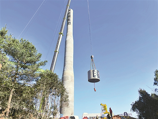 近日,龙源电力云南公司竹子山风电项目陆续开工。工地上,吊装班组工人正吊起一段重达60吨的混凝土塔筒。这是在西南地区首次大规模使用混塔结构的风机,塔筒高120多米,由29节混凝土塔筒和一节钢塔叠在一起,较传统的钢结构塔筒,具有稳定性更强、机舱震动小、发电效率更高、更加安全可靠的优势。涂启志 摄
