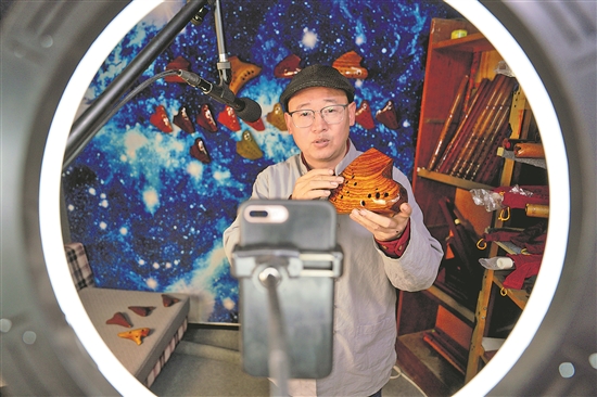 2月20日,陶笛艺人侯义敏在直播中讲解木质陶笛的相关知识。
