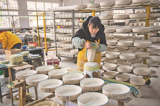2月22日,在醴陵陶润实业发展有限公司生产车间,工作人员在给瓷器半成品做丝网印刷。