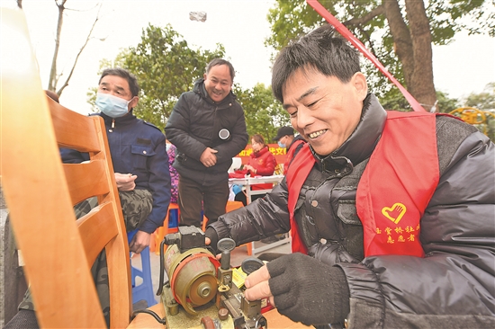 2月22日,浙江省湖州市,锁匠刘寿涛在志愿服务站为群众配钥匙。