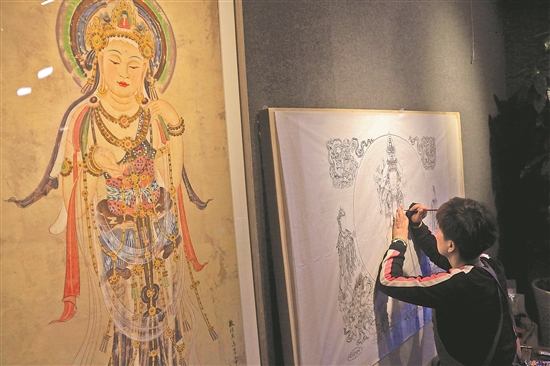 2月22日,在敦煌小镇鸣沙书院,来自陕西的学员吴恩梵学习敦煌壁画临摹技艺。