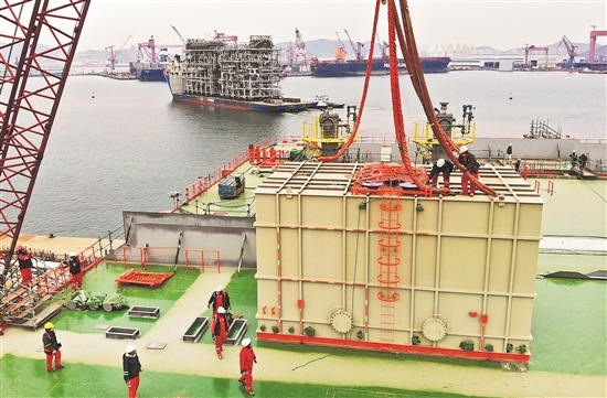 图为正在建造中的渤中19-6凝析气田一期CEPA(中心处理平台)组块。新华社记者 李紫恒 摄