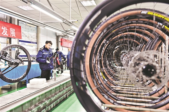 2月21日,在泰山瑞豹复合材料有限公司,工作人员在生产碳纤维自行车。