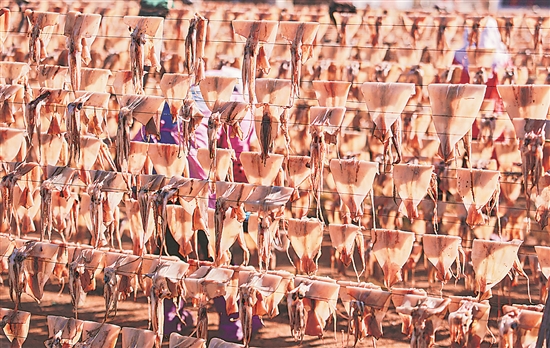 近日,山东省荣成市靖海湾畔的渔民利用晴好天气,在晾晒场抓紧晾晒鱿鱼,铺展开一幅春日“晒鲜图”。近年来,当地渔民通过电商平台将鱿鱼干制品销往各地市场。
