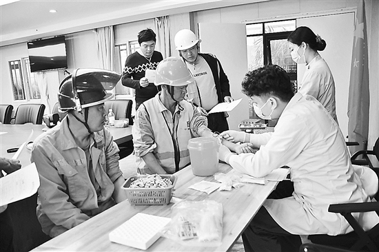 2月18日,在广东省深圳市中建三局中山大学第七附属医院项目工地上,54岁的普工赵军正在接受免费抽血,咨询了解自己的身体状况。当日,共有500余名参加体检的工友有序排队,进行血常规、胸透、心电图等15个项目的检查。来自深圳市宝田医院的医护人员耐心解答工友提问,并现场指导如何处理施工过程中的常见突发情况。