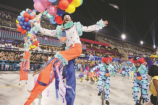 当地时间2月21日凌晨,在巴西里约热内卢桑巴大道,一名桑巴舞校演员参加狂欢节游行。