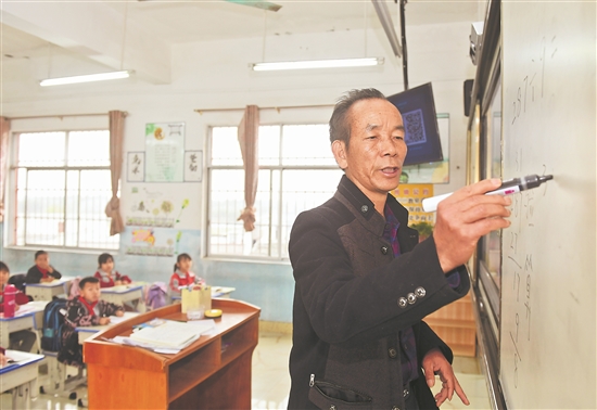 在广西宾阳县王灵镇中心学校七新教学点,王英红老师在给学生上课。一边吃着抗癌药,一边坚持给学生上课……现年58岁的王英红老师这样坚守乡村讲台已经第五个年头。