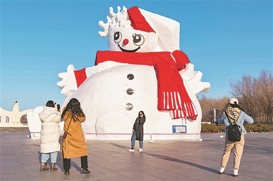 2月25日,游客在哈尔滨太阳岛雪博会入口的雪塑前拍照。当日17时,第35届中国·哈尔滨太阳岛国际雪雕艺术博览会停止展出,在开园最后一天,不少游客前来观赏游玩。