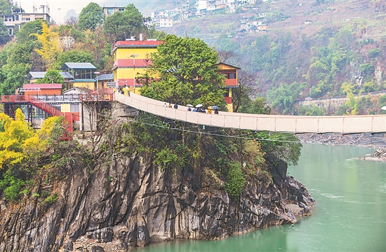 2月22日,游客通过架设在怒江上的吊桥进入云南省福贡县施底村秘境湾。秘境湾景点位于云南省怒江傈僳族自治州福贡县上帕镇施底村,地处怒江西岸。