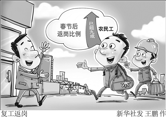 江苏省人力资源和社会保障厅一体化信息平台最新监测分析数据显示,截至2月15日,江苏农民工春节后返岗比例已超九成,就业规模达到常态化水平。新华社发 王鹏 作