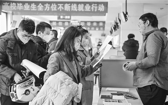 2月22日,山东济南的求职者正在人才市场大厅内查看招聘信息。当日,2023年重点企业用工保障招聘会在济南人才市场举行,70余家用人单位携1600余个招聘岗位到场招贤纳士。 张勇 摄/视觉中国