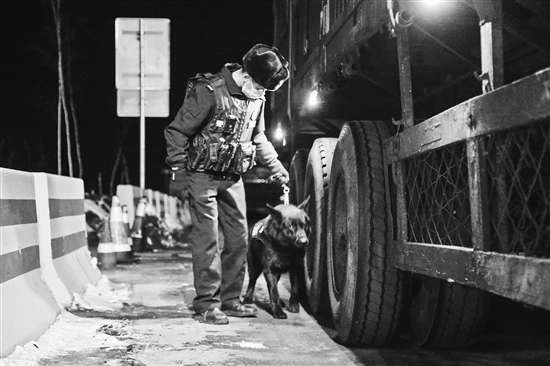 2月27日,新疆阿勒泰边境管理支队塘巴勒边境检查站移民管理警察在近零下20摄氏度的寒冷天气下,坚守岗位,严格按照勤务等级,对进出边境管理区人员、车辆实行24小时双向查缉机制,筑牢边境一线的安全屏障。图为当日检查站执勤民警携警犬“冠力”对车体进行检查。杨帅 摄/中新社