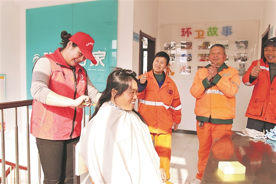 3月1日,安徽合肥包河区祁门路与呈坎路口的工会幸福驿站里,青年志愿者正在给环卫工人理发。包河区的一些工会幸福驿站由工会和环卫部门共同建设,为户外工作者提供休息纳凉、热水热饭等服务。本报记者 陈华 本报通讯员 丁勤 摄