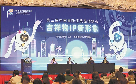3月3日,第三届中国国际消费品博览会吉祥物IP新形象新闻发布会在海口举办。在往届吉祥物“元元”和“宵宵”的基础上进行拓展设计而打造的吉祥物IP新形象“机械猿”正式亮相。新华社记者 樊雨晴 摄