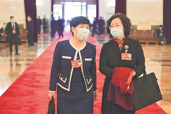 3月4日,全国政协十四届一次会议在北京人民大会堂开幕。来自中华全国工商业联合会的景普秋委员(图左)与来自中国国民党革命委员会的赵素卿委员一同步入会场。当日,来自34个界别的2100多名新一届全国政协委员肩负亿万人民的殷切期待,齐聚首都共商国是。本报记者 王伟伟 摄