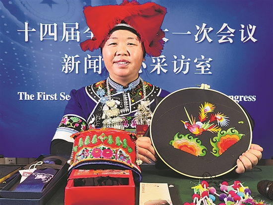 全国人大代表王陆芬是云南省砚山县纸艺刺绣农民专业合作社理事长。她的合作社从最初26个绣娘发展到现在2000余人,其中一半以上是50岁以上的妇女。这些女性靠刺绣增加了收入。王陆芬表示,她和姐妹们将继续用双手“绣”出更加幸福美满的生活。新华社发