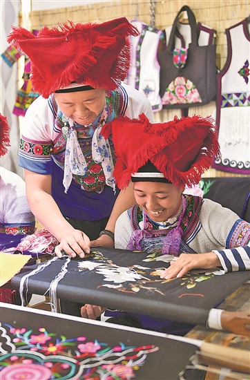 王陆芬(左)在位于云南省砚山县维摩乡白沙坡村的刺绣车间指导彝族绣娘(2019年4月26日摄)。新华社记者 杨宗友 摄