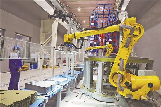 在哈电集团哈尔滨电机厂有限责任公司的数字化智能示范车间,工人观察机械臂作业。新华社记者 王建威 摄