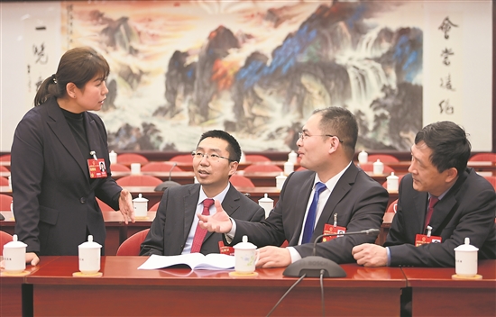 3月5日,十四届全国人大一次会议山西代表团,范银莲、童明全、张世丽、郝持胜(从左到右)等来自企业一线的代表在热烈讨论。李联军 摄