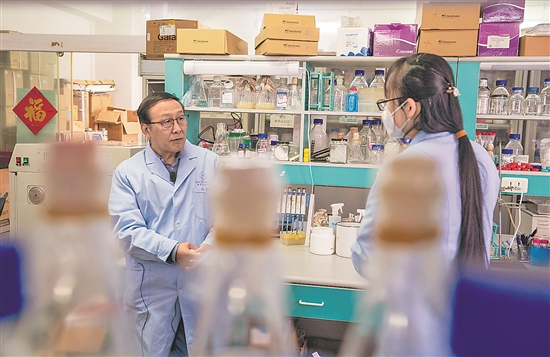 张克勤(左)在实验室了解实验进度(2月6日摄)。