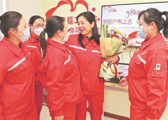 3月2日,在胜利油田现河采油厂“张春荣工作室”,中国石化技能大师、齐鲁首席技师张春荣与徒弟们共同迎接“三八”国际妇女节。张春荣是中国石化开发板块唯一的女技能大师,多年来她带出了138名徒弟,其中25人晋升技师或高级技师,30人次在油田及以上技能大赛中摘金夺银。图为张春荣分享成长感悟后,徒弟献上鲜花。王国章 张欢欢 摄