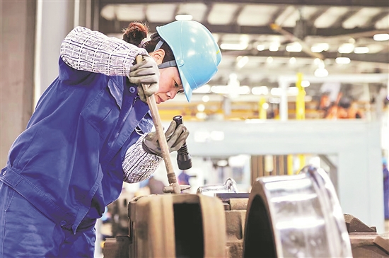 在中国铁路上海局集团有限公司南京东车辆段徐州北检修车间转向架班组,负责转向架落成交验工作的王广静是新生产线上唯一的女性。“如果把这条生产线上男职工的工位比作逗号的话,那么静姐这个工位就是完美的句号。班组每天能提供高品质的转向架,静姐是名副其实的‘半边天’!”工长赵新说。余爱国 马红旗 摄