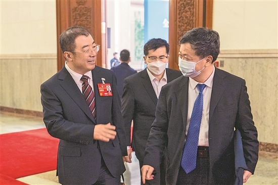 图②:3月7日,全国工商联副主席、奇安信集团董事长齐向东委员(左一)在人民大会堂与同伴交流。他建议用“零事故”目标筑牢网络安全防线。