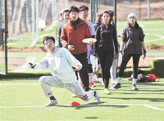 近日,在北京市朝阳区的东枫国际体育园,飞盘爱好者进行传接盘练习。新华社记者 任超 摄
