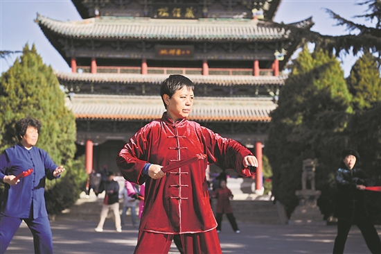 近日,在太原市迎泽区迎泽公园,市民在练习太极扇。新华社记者 詹彦 摄