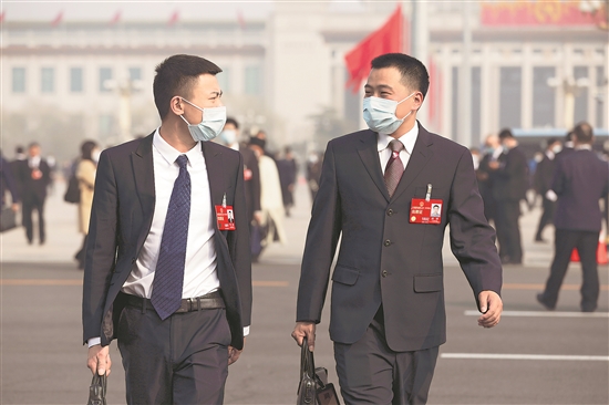 3月7日下午,参加十四届全国人大一次会议第二次全体会议的代表们步入北京人民大会堂。中国建筑第五工程局有限公司总承包公司项目质量总监邹彬代表(图左)偶遇广州港黄埔港务分公司安全环保部经理助理周冲代表,一位是世界技能大赛冠军,一位是见义勇为的“托举哥”(徒手托举失足悬挂阳台女童10多分钟)。两位来自基层一线的农民工代表,今年的建议都和技能人才培养有关,希望通过他们的鼓与呼为建设技能强国贡献青春力量。