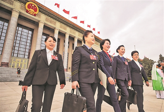 3月11日,北京市石景山区垃圾清运队操作员刘明群代表、北京公共交通控股(集团)有限公司电车客运分公司第十七车队BRT2路驾驶员何少花代表、北方昆曲剧院国家一级演员顾卫英代表、北京首发集团京开分公司榆垡所收费班长王争代表、北京金象复星医药股份有限公司白塔寺药店执业药师张海鸥代表(从左至右)一起走出北京人民大会堂。她们来自生产一线,带来了接地气、冒热气的建议和议案。本报记者 杨登峰 摄
