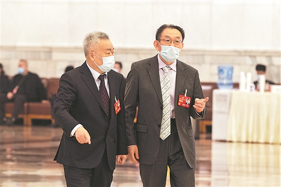 3月11日,在北京人民大会堂中央大厅,全国政协环境资源界别的高吉喜委员(图右)同中国科学技术协会的水利工程专家邓铭江委员交流。本报记者 王伟伟 摄