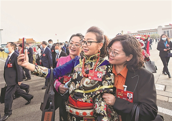 3月11日上午,十四届全国人大一次会议在北京人民大会堂举行第四次全体会议。会前,青海省黄南藏族自治州同仁市自来水公司职工夏吾卓玛代表(图中)和家人视频电话,分享参会的心情。本报记者 杨登峰 摄