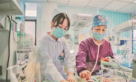 严争(右)在NICU(新生儿重症监护病房)查房。受访者供图