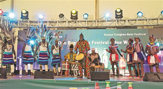 当地时间3月11日,艺术家们在肯尼亚首都内罗毕举办的青岛啤酒节上表演歌舞。当日,肯尼亚首届青岛啤酒节活动在内罗毕举办,吸引不少当地民众参与。
