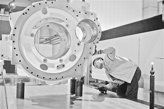 在天津市一家科技公司,工人在对风电机组减速机箱体进行检测(3月8日摄)。