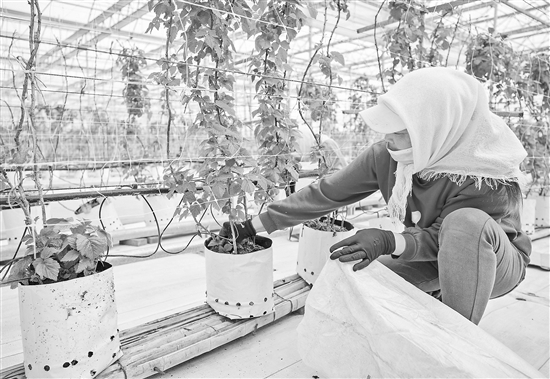农民在宁夏贺兰县洪广镇欣荣村红树莓种植基地温室内劳作(3月10日摄)。